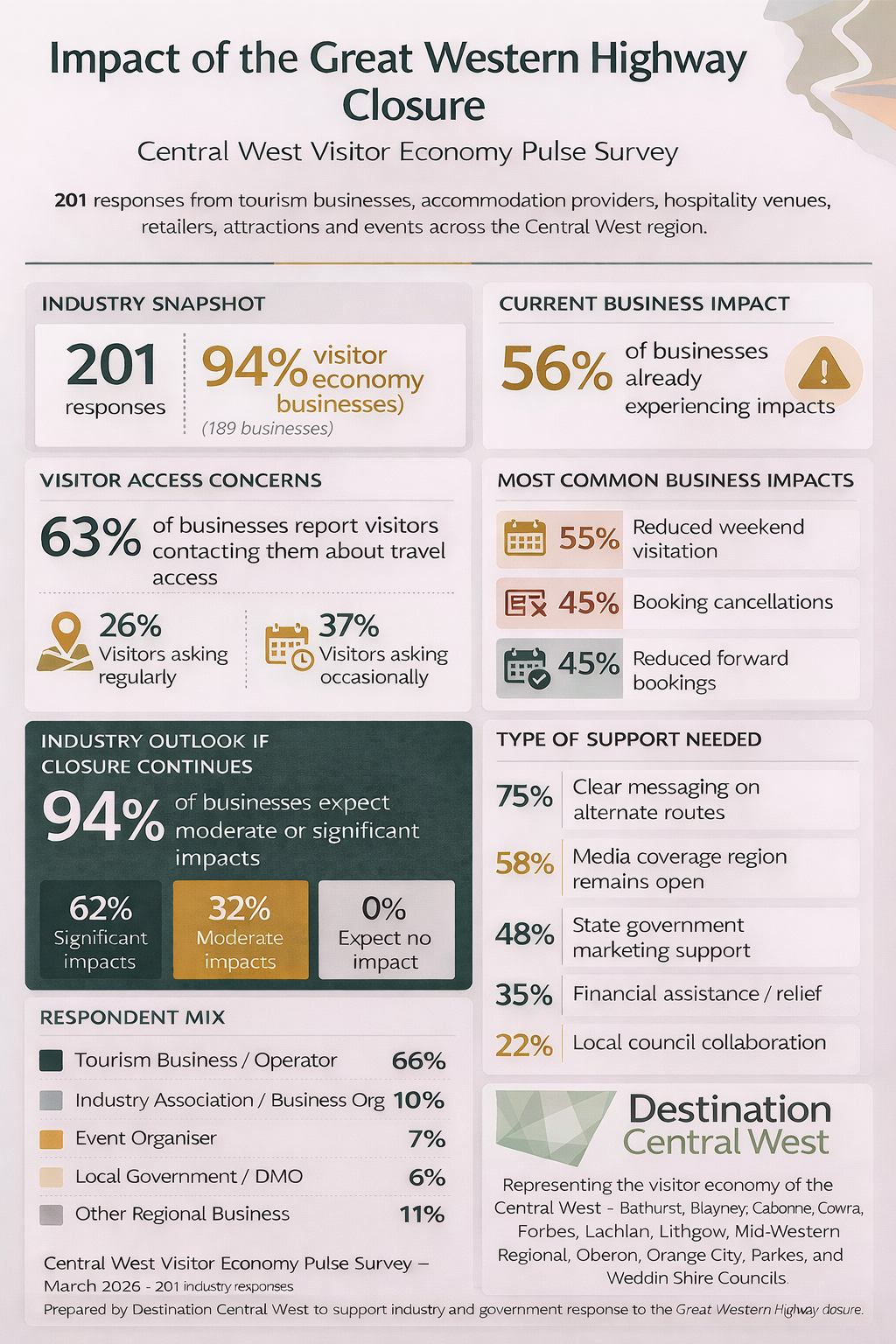 To better understand the impacts on businesses, Destination Central West undertook a rapid Visitor Economy Pulse Survey across the region in mid-March 2026. In a short period, the survey received over 200 responses from tourism businesses, accommodation providers, hospitality venues, retailers, attractions and event organisers across the Central West. A snapshot of the findings is included below.